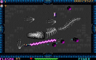 Finally, i get to the level boss. It's trilobite with purple antennas. The weakpoint is its body when it's uncovered to fire bullets at me. Pretty lame, i would say. I like to talk about another weapon: plasma. The ammo is a tube of electric pink cell that you can see in previous screenshot. It's definitely step up from the standard gun and can be used in practically any situation. Perhaps the drawback of the weapon is it drains ammo faster than the flamethrower.